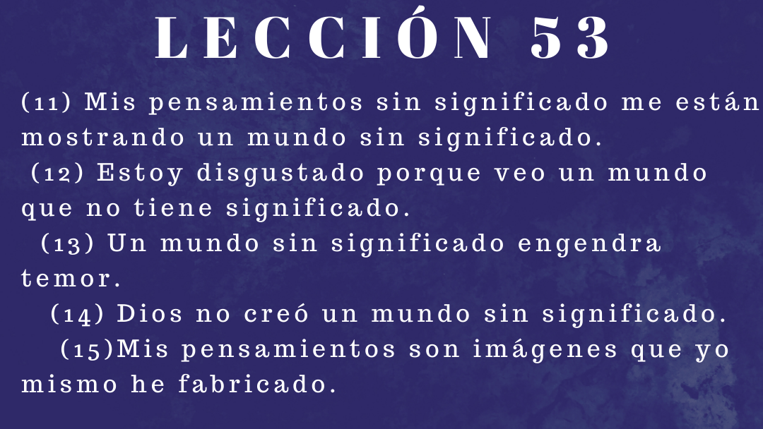 Los pensamientos dementes perturban. Dan lugar a un mundo en el que no hay orden de ninguna clase. Sólo el caos puede regir en un mundo que representa una manera de pensar caótica, y el caos es la ausencia total de leyes. No puedo vivir en paz en un mundo así. Estoy agradecido de que este mundo no sea real, y de que no necesito verlo en absoluto, a menos que yo mismo elija otorgarle valor. Elijo no otorgarle valor a lo que es completamente demente y no tiene significado.