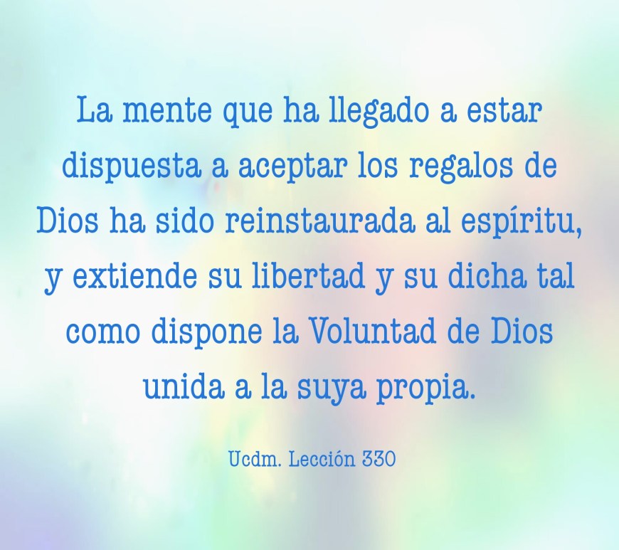 Comentario: No hay nada que no puedas hacer si te unes al Espíritu Santo, y a través de Él a tu hermano. En tu hermano a sí mismo, reconocerás al propio Espíritu Santo dándote la bienvenida, y así os unís en perfecta armonía. La unidad queda consagrada y aceptada, la plenitud restaurada y la paz acude naturalmente, pues allí dónde dos se han unido, la separación cesa. Continúa leyendo LECCIÓN 161. Dame tu bendición, santo Hijo de Dios.